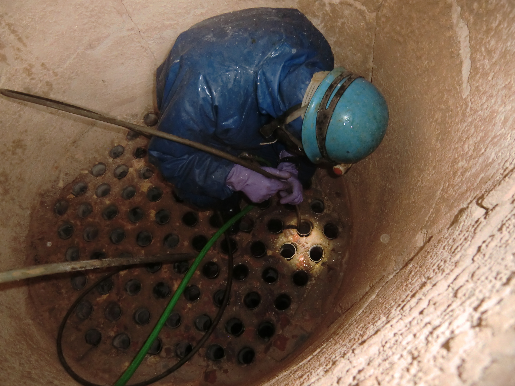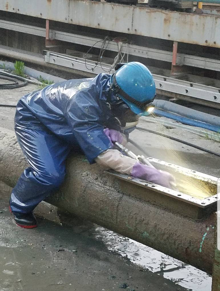 弊社は安全確保を企業活動の根幹として指導・教育を徹底しており、施工においても有毒ガスが充満しているなかで作業を行なうケースがあるため、防護スーツを着用するなど二次被害が発生しないよう細心の注意を払っています。